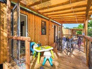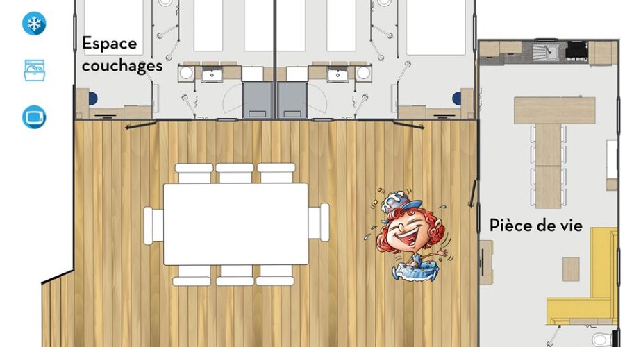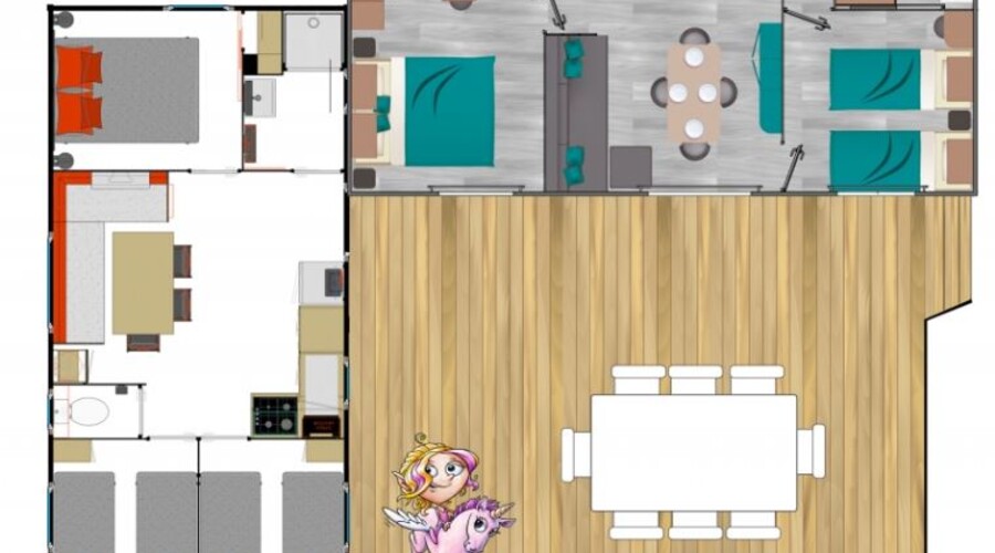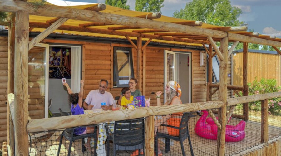 Le Tribu Villa, c'est l'idéal pour passer des vacances entre amis! Il y a un espace « pièce à vivre » et un autre espace « nuit » bien distincts. Le premier mobil-home dispose de 4 chambres et de 2 salles de douches avec WC. Une cloison intérieure au milieu permet d'optimiser et de rendre plus indépendante chaque famille ou amis. Le second mobil-home offre un espace de vie généreux avec coin cuisine équipée avec îlot, table, chaises et coin canapé. Au centre : une belle terrasse avec coin salon et un coin repas!