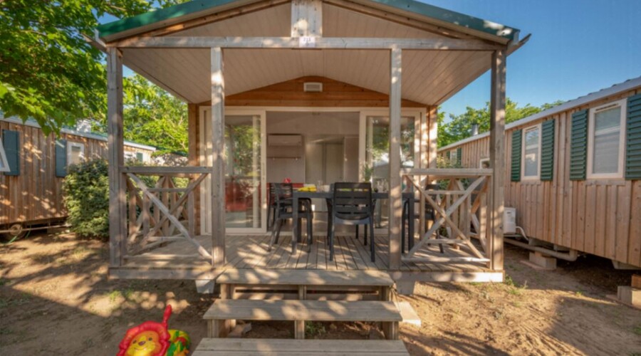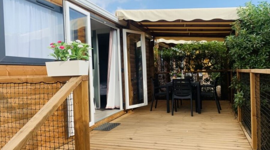 C'est un grand emplacement de 170 m² sur lequel 2 mobil-homes partagent une grande terrasse !